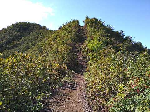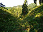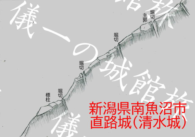 直路城探訪ルート(ジオグラフィカ使用) 別名清水城という。 標高1900mの柄沢山の尾根先に築かれた城である。 西麓の登川沿いを走る清水街道(国道291号)を抑える位置にある。 国道291号線の途中から見上げた直路城遠景。 越後と関東を隔てる清水峠への途中に作られた城。 南魚沼市内から国道291号線を南下していき、車両通行止めに当たった所に城がある。 直路城の麓、国道291号線の車両通行止め地点の様子。 ここに車を停める人もいるようだが、折り返していく車の事を考慮し道路を戻って路肩に停めて訪問した。 先の行き止まりから左に曲がって徒歩で登て行くと写真の登山道に出る。 写真の場所は地図の現在地(赤矢印)になる。 痩せ尾根を堀切で数条切るだけのシンプルな遺構だが、堀切は思ったより深く鋭い。 尾根筋まで登り、北の山間を見る。 高い山に囲まれているものの、旧塩沢町の中心地が見渡せる。 直路城の鳥観図風お絵描き。 主郭から背後のみならず麓に向かって三条の堀切がある。 これは麓からの攻撃に備えたものである可能性を示し、 関東から越山した勢力が平野部に向けての拠点とつかわれていた可能性もある。 PR |