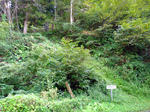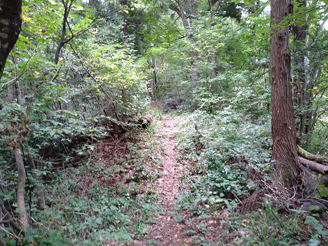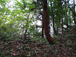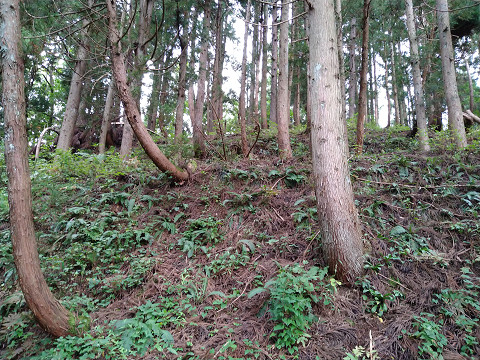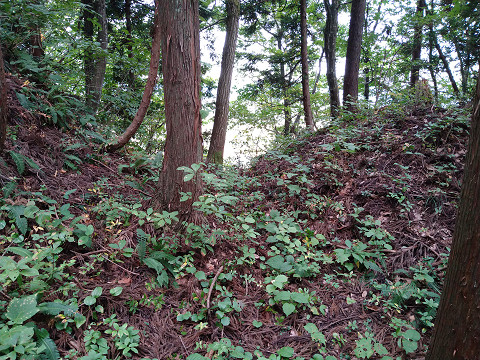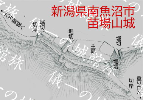 苗場山城訪問ルート 六万騎城背後から北に延びる尾根先に作られた城。 城から更に三方に尾根が伸びているが、藪が多い。 その内中央の尾根はなんとか歩けるレベルであった。 写真中央の山が苗場山城。 入口の目印は城の北部にある小さな池で、 この付近の山林(写真左上の森)から入っていく。 三つの尾根の内真ん中の尾根を登り詰めると切岸が見えてくる。 ここは真横に伸びる灌木が無くて、歩きやすいのが良い。 しばし尾根を登ったら堀切が見えてきた。 別の堀切。 ここは入口が分からないだけで、 城自体は見やすくって助かった。 割とシンプルな構造ながら良い城だ。 苗場山城の鳥観図風お絵描き。 尾根先の小ピークを主郭とし、堀切と段曲輪をいくつかつけている。 ここの構造的に六万騎城の支城という役割であろう。 |