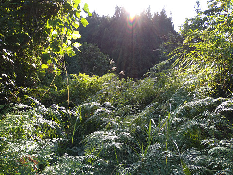 御館城所在地(国土地理院地図へ) 御館t城の近景。 背後の八海山系の猿倉山(687.8m)から 北に派生する尾根先に築かれた城である。 遠くからは周囲の山に溶け込んで分かりにくい。 現地は大崎ダム公園となっており、 八海山の大崎口コースの入り口で駐車する。 駐車スペースは広いので、満車はまずない。 ここに車を停めて大崎ダム公園の中へ会談を降りて進む。 田川がダムによって堰き止められた人造湖を右回りに進む。 大崎ダム公園の案内図。 左上の破線先にチョロっと御館城が書かれている。 御館城の入り口。 入り口には御館城への看板が建てられている。 ここかはら道が狭く油断しないように登っていく。 やがて城の真下を通り城の付け根部分に到着する。 ここは木がないのでシダが繁殖しまい藪化しているが、 灌木でないだけ藪漕ぎは楽である。 右に曲がり主郭へ向かう。 主郭は広いが北に向かって傾斜している。 これで居住性があったのかは不明。 傾斜角度は写真の通り。 主郭脇の堀切。 木が無く堀底に降りるのがちょっと大変だったが、 見事なV字を描いている。 反対側から。 灌木で美しい堀切が撮影できない事が多いこの地域で、 非常に貴重な城と思えてしまう。 御館城の鳥観図風お絵描き。 田川の支流尻無沢と無沢に挟まれた尾根をりようしており、 周囲が高い山に囲まれている為か 杉が雪で倒木されず余計な灌木もない美しい堀切を見させてもらった。 一説には南北朝期の脇屋義治の館という言い伝えもあるように、 場所といい構造を見ても、れ用の城であった可能性は高いだろう。 |