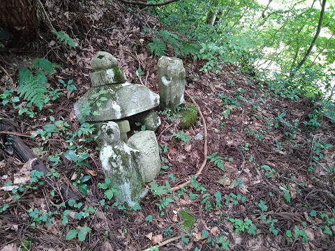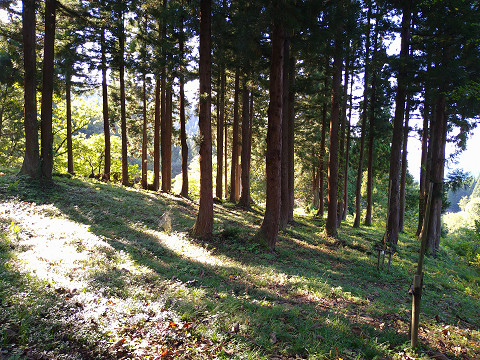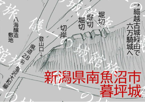 暮坪城へのルート 暮坪城遠景。 暮坪城自体は主郭が無く、尾根を封鎖するために作られた 比高20m程度の小さな砦である。 暮坪城への入口は八海酒造付近の県道を挟んだ麓にある。 上の地図にある現在地(赤矢印の所)が入口の場所。 ハイキング道として整備されており、 藪漕ぎもせずに城に行けるのはありがたい。 ちなみに今回八海酒造北西の水田地帯の道に路駐した。 入口のアップ。 入口を入ってすぐの所に熊の目撃情報が書かれていた。 登り始めて最初の曲輪に五輪塔が建っていた。 果たして誰の墓なのであろうか。 城内の様子。 堀切が連続している所を撮影しているが、 堀が浅くて障害物になっていない気が。 最深部の堀切から細越古城までは人工の地形はあったが、 城と呼べる構造体ではなかった。 なのでここまでが暮坪城の全体と見て良さそうだ。 暮坪城の鳥観図風お絵描き。 細越古城から派生した尾根の先端部分を加工した遮蔽構造であり、 暮坪城自体は城と呼び難い構造となっている。 比高20m程度で堀切も浅いので簡素な造りと言える。 天文七年(1510)の長森原の合戦があった長森地区にあり、 この城も時の関東管領上杉顕定の最後を見届けたかも知れない。 歴史経緯の不明なこの城もそういう視線で見ると 感慨深い遺構になるのかも知れない。 |